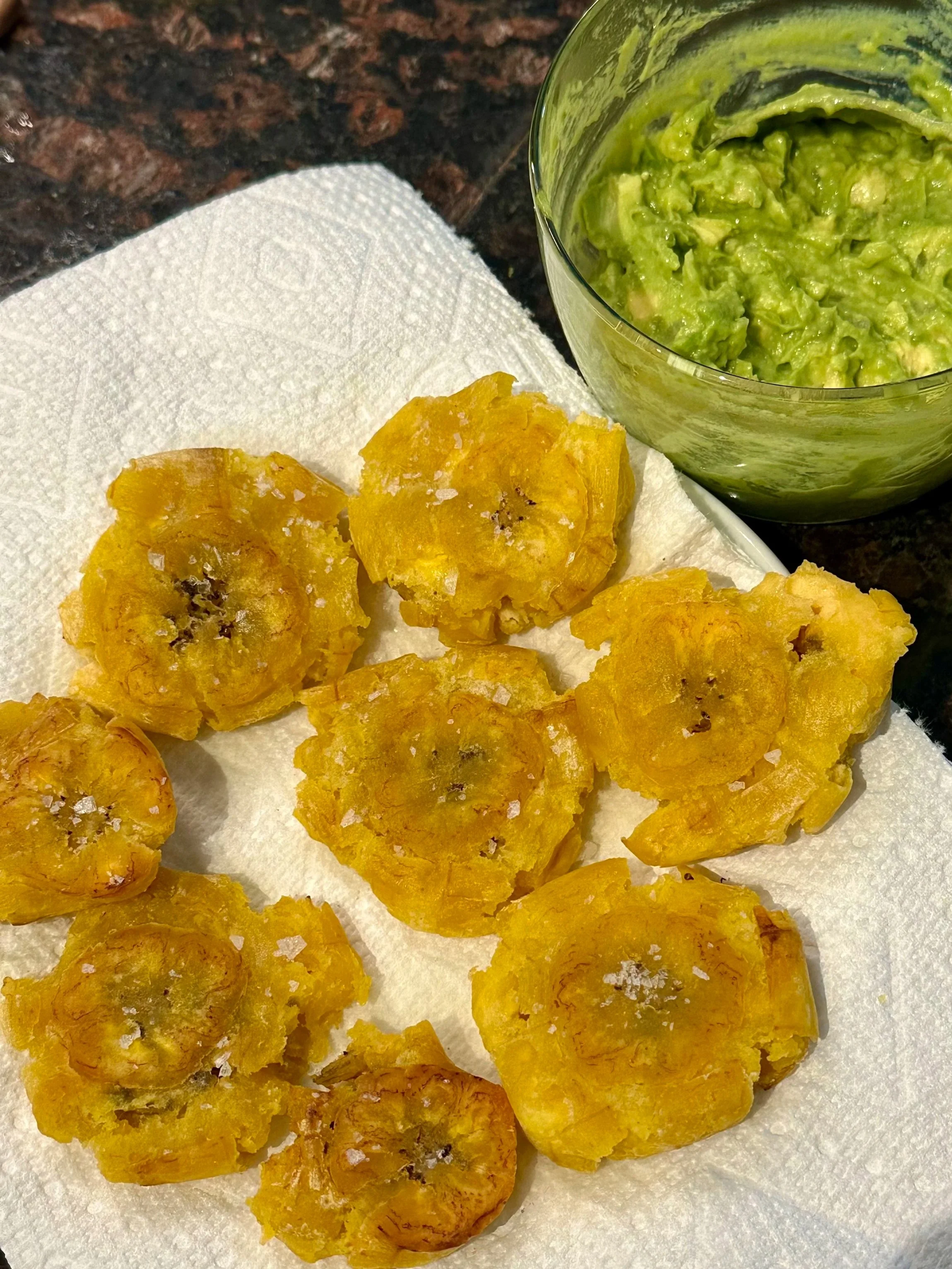 Tostones are twice-fried green plantains—crisp, salty, and perfect for dipping. I’d never made them before, but it felt like a fun challenge. The process wasn’t exactly easy (the mashing part was messier than expected), but it was worth it.